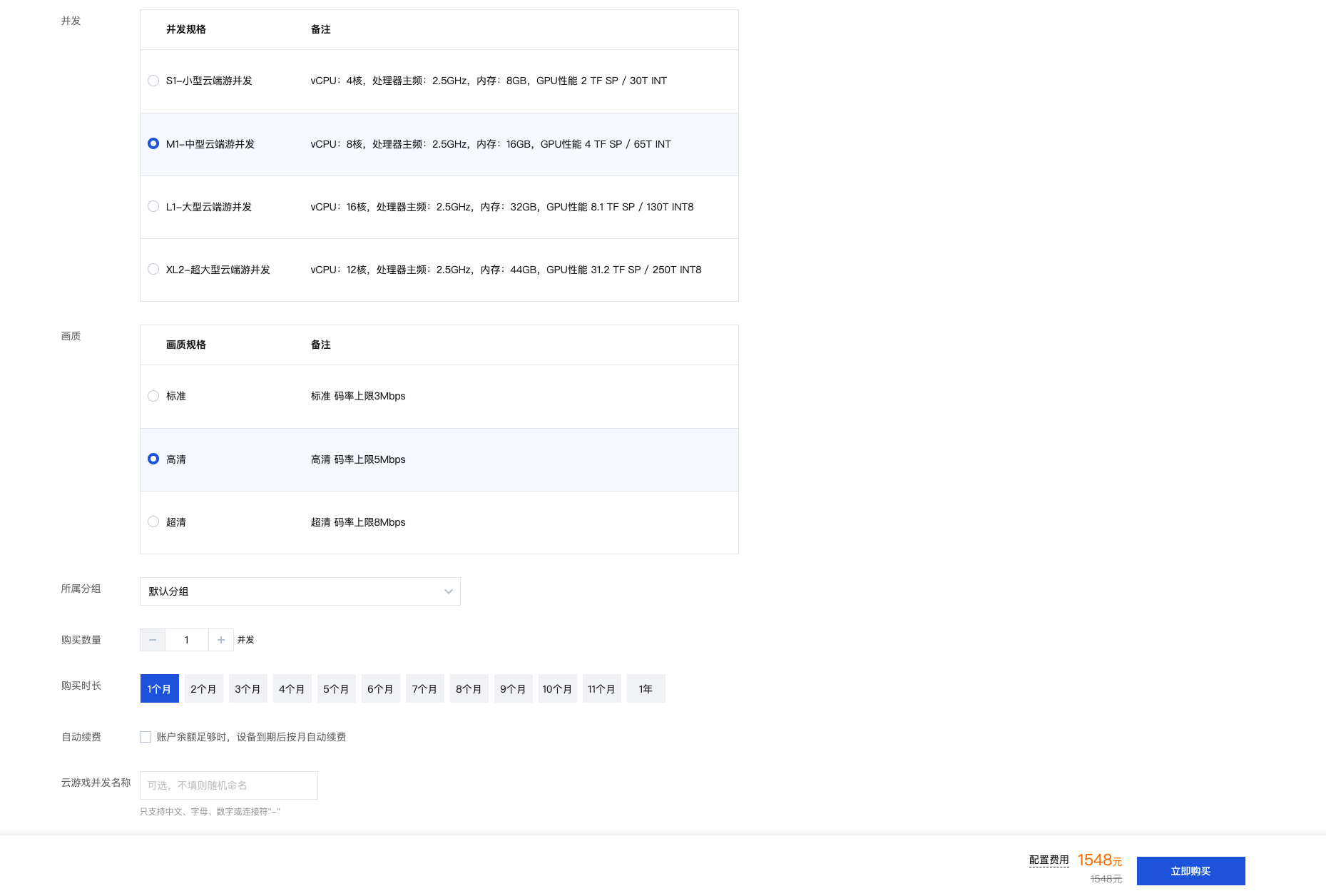M1-中型云端游并发 vCPU:8核,处理器主频:2.5GHz,内存:16GB,GPU性能 4 TF SP / 65T INT